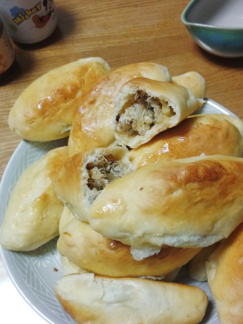 ピロシキ:焼き鯖で作った新作、およびポピュラーなミンチのものを出します。